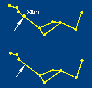 Mira atrodas spožuma maksimumā (augšā) un minimumā (lejā). 3 kb