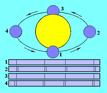 Spektrālās dubultzvaigznes komponentu kustība un spektrāllīniju nobīde zvaigznes spektrā (1, 3 – mazākajai zvaigznei radiālā ātruma nav, 2 – zvaigzne attālinās no novērotāja, 4 – zvaigzne tuvojas novērotājam). 4 kb