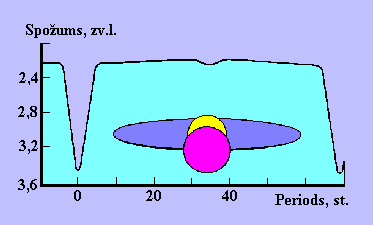 Algola spožuma maiņas līkne. Parādīts zvaigžņu izvietojums aptumsuma laikā. 4 kb