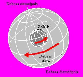 Debess rotācija ir šķietama. Patiesībā tā ir Zeme, kas griežas ap asi. Ja skatītos uz Zemi no kosmosa (no Zemes ziemeļpola puses), tad varētu redzēt, ka Zeme griežas pretēji pulksteņa rādītāju kustības virzienam (no rietumiem uz austrumiem). Bet, tā kā novērotājs ir saistīts ar Zemi, viņš šo kustību nejūt un viņam liekas, ka griežas debess, tikai pretējā virzienā - pulksteņa rādītāju kustības virzienā ( no austrumeim uz rietumiem). Debess rotācija notiek ap asi, kas paralēla Zemes griešanās asij. To sauc par pasaules asi, tā iet caur novērotāju un krusto debess sfēru punktos, ko sauc par debess poliem. Vienu no poliem – debess ziemeļpolu jau aplūkojām, bet debess dienvidpols atrodas Oktanta zvaigznājā, kas Latvijā nav redzams.