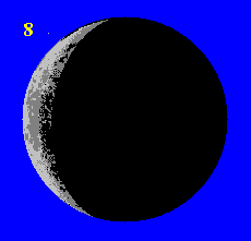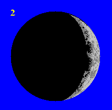 Pāris dienas vēlāk Mēness parādās vakaros rietumu pusē kā šaurs sirpis ar izliekumu uz Saules pusi |