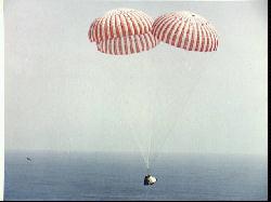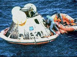 | Kosmosa kuģa Apollo nolaišanās okeānā. NASA foto | Uz Apollo nolaižamā aparāta sāniem redzamas apdeguma pēdas, kas radušās, lidojot cauri atmosfērai. NASA foto | Apkalpes kuģis CRV planē atmosfērā izmēģinājumu laikā. NASA foto |