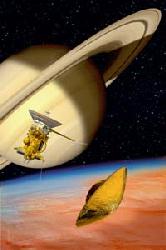 | Zondes Cassini nolaižamo aparātu sedz termoekrāns, kas pasargā iekārtas no pārkaršanas nolaišanās laikā. NASA zīmējums | Zondes Galileo nolaižamais aparāts ar izpletni laižas lejup Jupitera atmosfērā. NASA zīmējums |