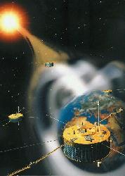 | Ģeofizikālie pavadoņi. Pēta atmosfēras augšējos slāņus, jonosfēru un magnētisko lauku, mikrometeorītu plūsmas un kosmisko starojumu. Pirmos ģeofizikālos mērījumus kosmosā veica ASV pavadonis Explorer – 1, kuru palaida 1958. gada 1. februārī. Attēlā: ESA ģeofizikālo pavadoņu kopa Cluster. ESA zīmējums | ![]() |