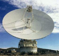 | No Zemes apkārtnes ceļā uz Jupiteru dodas zonde Galileo. Zonde pievienotā raķešpakāpe vēlāk tiks atdalīta. NASA zīmējums | Radioteleskops kosmisko sakaru uzturēšanai. NASA foto |