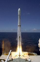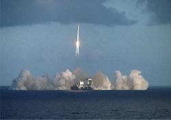 | Nesējraķete Pegasus XL zem lidmašīnas korpusa. NASA foto | Raķetes starts no okeānā bāzētās platformas Sea Launch. Boeing foto |