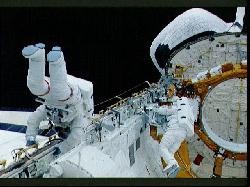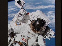 | Darbs atklātā kosmosā. NASA foto | Astronauts reaktīvajā krēslā. NASA foto |