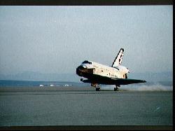 | Orbitālā lidmašīna kosmosā ar atvērtu kravas lūku. NASA foto | Kosmoplāns nolaižas uz skrejceļa. NASA foto |