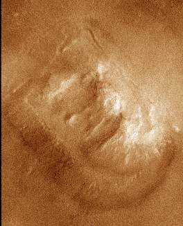 | “Seja” uz Marsa Sidonijas apgabalā, kuru nofotografējusi zonde Viking. NASA/JPL attēls. 5,3 kb | Mars Global Surveyor iegūtais “sejas” attēls. Malin Space Science Systems/NASA attēls. 16,6 kb |