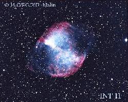 | Kaķa Acs planetārais miglājs Pūķa zvaigznājā. HST/STScI attēls. 23,2 kb | Hanteles planetārais miglājs Lapsiņas zvaigznājā. AAT attēls. 27,0 kb | Liras gredzenveida planetārais miglājs. AURA/NOAO/NSF attēls. 9,2 kb |