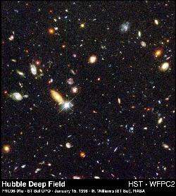 Šajā Habla kosmiskā teleskopa uzņēmumā, kurā parādīts neliels debess apgabals Lielā Lāča zvaigznājā, redzam, ka debess ir burtiski noklāta ar tālām galaktikām. HST/STScI attēls. 129,0 kb