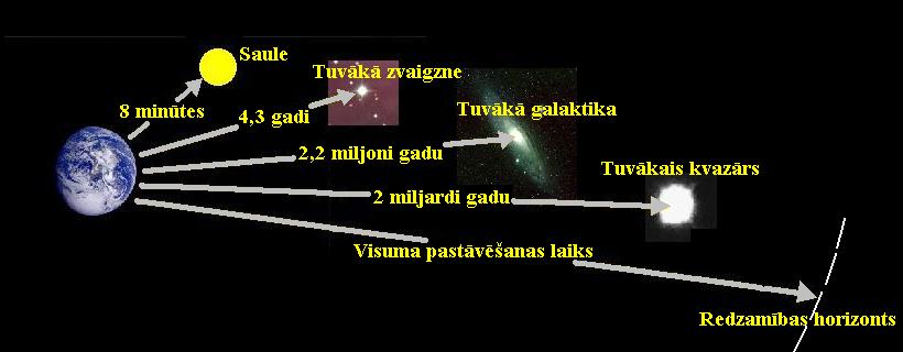 Tā kā gaismai nepieciešams noteikts laiks, lai sasniegtu Zemi, mēs redzam Visuma objektus nevis tādus, kādi tie izskatās pašlaik, bet gan tādus, kādi tie izskatījās pagātnē. I. Vilka zīmējums. 32,8 kb