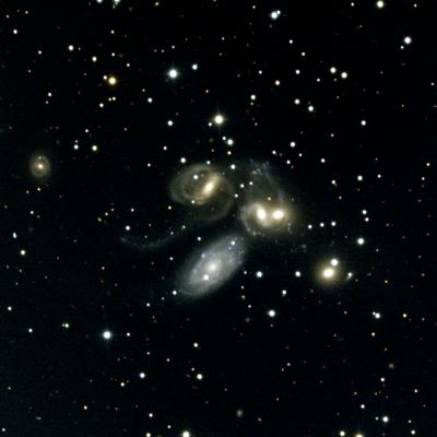 | Galaktiku grupa “Stefana kvintets”. Redzamas piecas galaktikas, priekšplānā atrodas mūsu Galaktikas zvaigznes. AURA/NOAO/NSF attēls. 15,5 kb | Berenikes Matu zvaigznāja galaktiku kopa. Šajā attēlā visi gaismas plankumi, kas nav punktveidīgi, ir atsevišķas galaktikas. AURA/NOAO/NSF attēls. 16,6 kb |