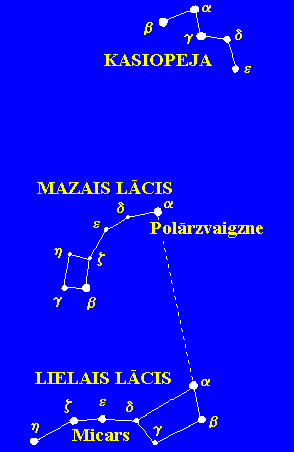 Nenorietošie zvaigznāji. No nenorietošajiem zvaigznājiem vislabāk pazīstams Lielais Lācis, ko latvieši sauc par Lielajiem Greizajiem Ratiem. Zvaigzne Micars Lielajā Lācī ir dubultzvaigzne. Mazā Lāča zvaigznājā atrodas viens no diviem debess poliem - debess ziemeļpols, kura atrašanās vietu iezīmē Polārzvaigzne. Savienojot ar iedomātu līniju Lielā Lāča kausa priekšmalas zvaigznes un turpinot to apmēram piecas reizes, nonāk pie Polārzvaigznes. Kasiopeja ir neliels zvaigznājs, kura spožākās zvaigznes veido figūru plata “W” burta izskatā. Nenorietošie zvaigznāji atrodas debess ziemeļpola apkaimē.