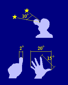 Cik lieli pie debess ir zvaigznāji un kādi ir zvaigzņu savstarpējie attālumi? Lai to noteiktu, jāveic leņķiskie mērījumi. Aptuvenai leņķisko attālumu noteikšanai ērti izmantot rokas mērus. Ja roku tur izstieptu, tad mazais pirkstiņš redzams 1° lielā leņķī, īkšķis - 2°, dūre - 10°. Sprīža “garums” ir 15°, bet no īkšķa līdz mazajam pirkstiņam leņķiskais attālums ir 20°. Šādi mērot, Lielā Lāča kausa garums ir aptuveni viens sprīdis un dūre, jeb 25°. No horizonta līdz zenītam ir seši sprīži (90°), tikpat liels attālums pa horizontu šķir, piemēram, dienvidu punktu un rietumu punktu. Mazāku leņķisko attālumu mērīšanai var izmantot Sauli vai Mēnesi, kuru leņķiskais diametrs ir 0°,5.