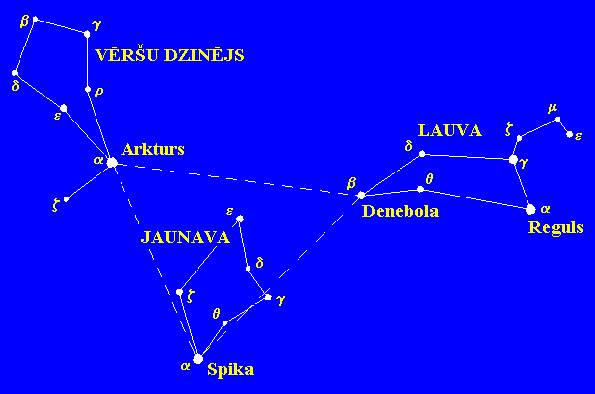 Pavasara zvaigznāji. Šajā gadalaikā debess nav bagāta ar spožām zvaigznēm. Pavasarī vislabāk saskatāmie zvaigznāji ir Lauva ar spožāko zvaigzni Regulu, Jaunava ar spožāko zvaigzni Spiku un Vēršu Dzinējs ar ļoti spožo zvaigzni - Arkturu. Blakus Vēršu Dzinējam izvietojies neliels zvaigžņu pusloks - Ziemeļu Vainags. Arkturs, Spika un Denebola (Lauvas b ) veido zvaigžņu trijstūri, ko sauc par pavasara trijstūri. Jaunavas zvaigznājā atrodas galaktiku kopa, kurā ietilpst vairāki tūkstoši galaktiku. Lauvas g un Jaunavas g ir dubultzvaigznes. Šajā gadalaikā redzamie zodiaka zvaigznāji ir Lauva, Jaunava un Svari.