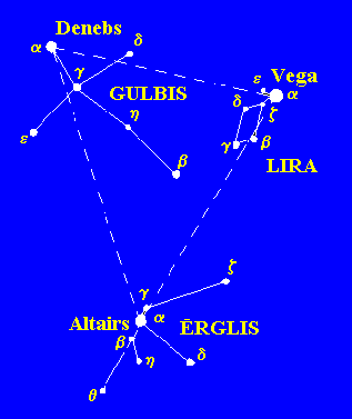 Vasaras zvaigznāji.Raksturīgākie vasaras zvaigznāji ir Lira, Gulbis un Ērglis. Tie redzami arī rudens pusē. To spožākās zvaigznes Vega, Denebs un Altairs veido vasaras zvaigžņu trijstūri. Šajā debess apgabalā atrodas divi spoži miglāji – Ziemeļamerikas un Hanteles miglāji. Zvaigzne Gulbja 61 ir viena no Saulei tuvākajām zvaigznēm. Vasarā redzamie zodiaka zvaigznāji - Skorpions, Strēlnieks un Mežāzis atrodas zemu pie horizonta. Skorpiona spožākā zvaigzne ir Antaress. Strēlnieka zvaigznāja virzienā atrodas Galaktikas centrs. Cauri Gulbja, Ērgļa, Strēlnieka un Skorpiona zvaigznājiem iet Piena Ceļš, kas šajā debess daļā ir visai spožs.