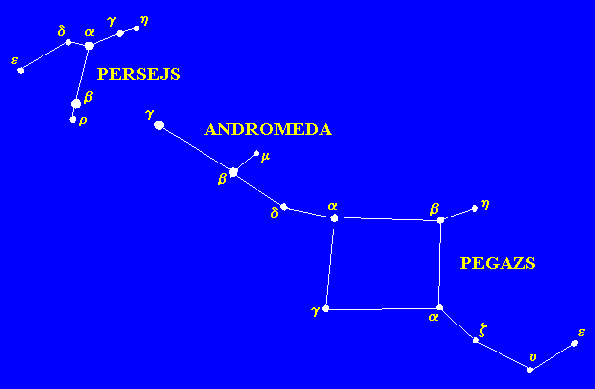 Rudens zvaigznāji.Rudenī vislabāk redzamie zvaigznāji ir Andromeda, Persejs un Pegazs. Tajos atrodami debess objekti ar visai atšķirīgu dabu: vaļējās un lodveida zvaigžņu kopas, mums tuvākā spirālveida galaktika, ko sauc par Andromedas miglāju un citi. Zvaigzne Algols Perseja zvaigznājā ir maiņzvaigzne. Pie rudens debess redzami trīs zodiaka zvaigznāji: Ūdensvīrs, Zivis un Auns. Zivju zvaigznājā atrodas pavasara punkts, kurā ik gadus ap 21. martu nonāk Saule. Plašajā Valzivs zvaigznājā, kas atrodas uz leju no Andromedas, ir divas interesantas zvaigznes - Valzivs t , kas ir viena no Saulei tuvākajām zvaigznēm un Valzivs o jeb Mira, kas brīžiem redzama, bet brīžiem atkal nē, jo tā ir maiņzvaigzne.
