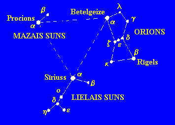 Ziemas zvaigznāji.Šajā debess apgabalā atrodas tādas spožas zvaigznes, kā Rīgels (Oriona b ), Procions (Mazā Suņa a ) un pati spožākā zvaigzne pie debess - Sīriuss (Lielā Suņa a ). Betelgeize (Oriona a ), Sīriuss un Procions veido ziemas trijstūri. Ļoti raksturīga ir Oriona zvaigznāja figūra, ko veido septiņas spožas zvaigznes. Trīs no tām novietotas vienā līnijā. Cauri ziemas zvaigznājiem iet plata Piena Ceļa josla. Vērša zvaigznājā, kas atrodas pa labi no Oriona, izvietotas divas lielas vaļējās zvaigžņu kopas, kas redzamas ar neapbruņotu aci: Hiādes un Sietiņš. Pie ziemas debess atrodami dažādas dabas miglāji - Krabja miglājs, kas izveidojies zvaigznes bojāejas rezultātā, un spožais Oriona miglājs, kurā notiek jaunu zvaigžņu rašanās. Sīriuss un Procions ir Saulei tuvas zvaigznes. Ziemā redzamie zodiaka zvaigznāji ir Vērsis, Dvīņi un Vēzis.