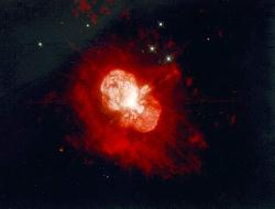 Masīvā galvenās secības zvaigzne Kuģa Ķīļa h ir daļēji saskatāma caur miglāju, kas to apņem. NASA/JPL attēls. 20 kb