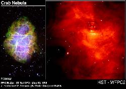 Pulsārs Krabja miglājā (pa kreisi esošā zvaigzne no divām zvaigznēm miglāja centrā). HST/STScI attēls. 55 kb