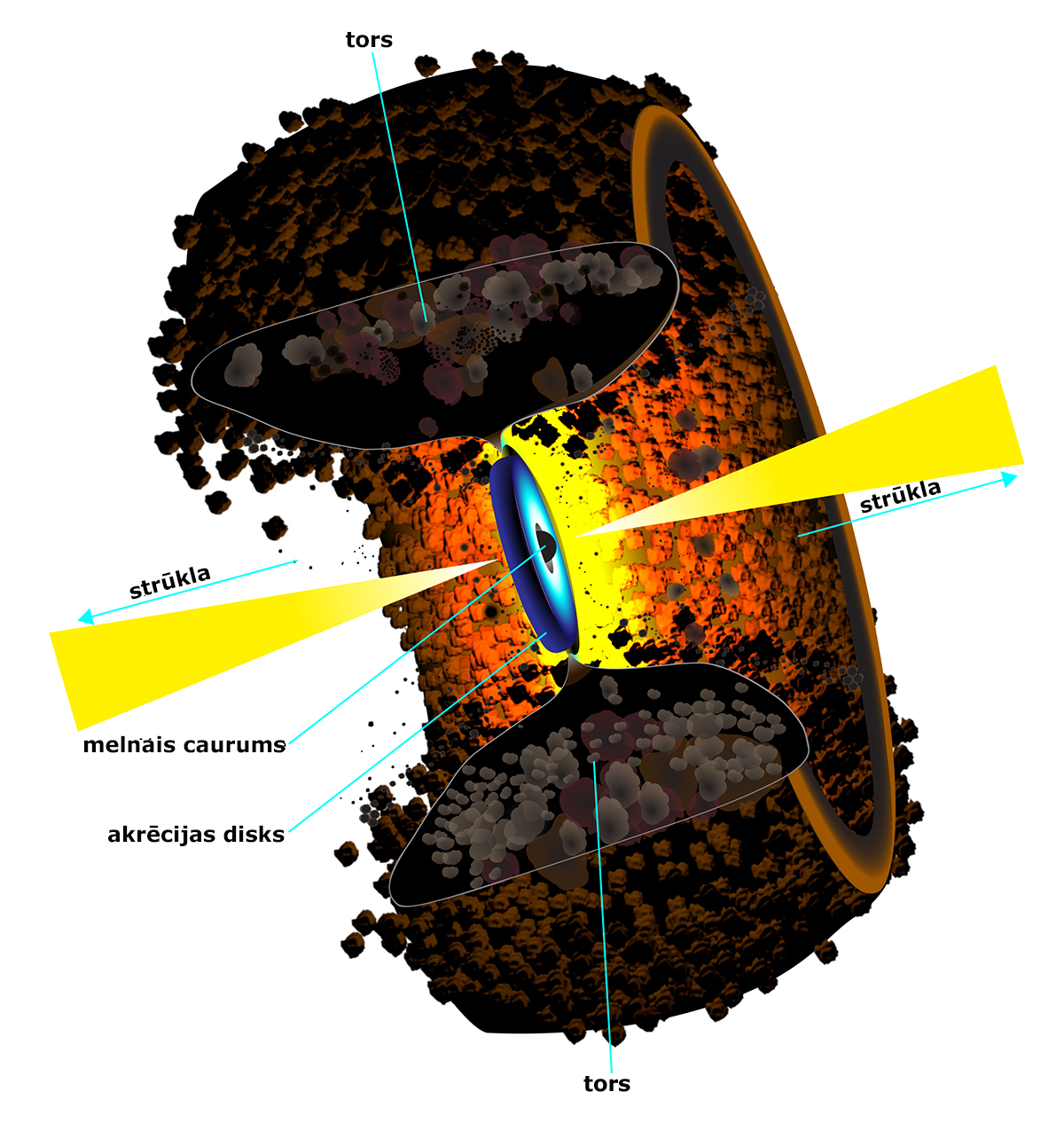 Vispirms apskatīsim pašas aktīvās galaktikas struktūru (12. att.). Tātad pašā vidū atrodas supermasīvs melnais caurums, kura masa var būt vairāku miljardu Saules masu liela. Apkārt tam atrodas akrēcijas disks, kas ir veidots no pārņemtām zvaigznēm, gāzes un putekļiem. Tas ir ļoti karsts, un tā temperatūra palielinās, jo tuvāk tas ir melnajam caurumam. Vistuvāk tam tas sasniedz vairāku miljonu kelvinu temperatūru. Tad ap šo melno caurumu un akrēcijas disku ir izveidojies elektronu plazma, kas ir kaut kas līdzīgs kā Saulei korona. No šī reģiona tiek izdalīts augstas enerģijas starojums, ko bieži vien novēro rentgenstarojuma vai gamma starojuma diapazonā. Un tad dažiem melnajiem caurumiem var novērot arī strūklas, kas izšaujas no to poliem. Dažiem melnajiem caurumiem to nav, dažiem ir tikai viena, dažiem ir abas, kā tas ir parādīts 12. attēlā.
