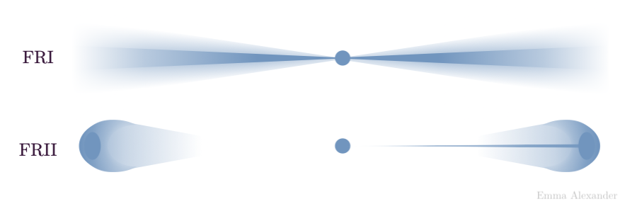 Pēdējā no 11. attēla klasifikācijām ir Fanarofa-Railija (FR) piedāvātā, kas salīdzina kodola un apkārtnes starjaudu (14. att.). Tātad FR I tipa aktīvajām galaktikām kodols ir spožākā struktūra, un tas paliek blāvāks tālāk no centra. Savukārt FR II veida galaktikām spožākā virsma radio diapazonā ir tieši ārpus kodola. Šajām aktīvajām galaktikām ir izteiktas lodveida struktūras, kas redzamas arī 13. attēlā. Tie ir mākoņi, kuri veidojušies no izmestā materiāla caur kodola strūklām.