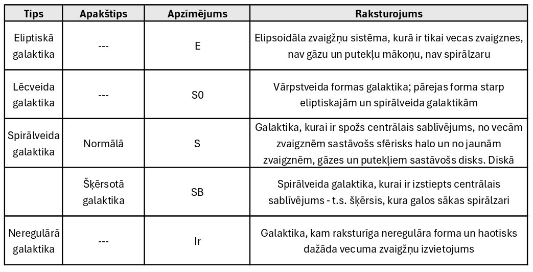 Pēc ārējā izskata galaktikas iedala eliptiskajās, spirālveida un neregulārajās galaktikās (1. att.). Eliptiskās galaktikas ir lodveida vai saplacināti zvaigžņu mākoņi. Tās apzīmē ar burtu E un to saspieduma pakāpi raksturo ar skaitli no 0 līdz 7. E0 tipa galaktikas ir lodveidīgas, bet E7 – stipri saplacinātas. Mūsu galaktika pieder pie spirālveida galaktikām. To raksturīgākā pazīme ir spirālzari. Spirālveida galaktikas dalās divās grupās. Normālajām spirālveida galaktikām (S) spirālzari sākas tieši no centra, bet šķērsotajām spirālveida galaktikām (SB) centrālais sablīvējums ir pagarināts un spirālzari sākas tā galos. Pastāv arī lēcveida galaktikas (S0), kas ir pārejas forma no eliptiskajām uz spirālveida galaktikām. Neregulārās galaktikas (Ir), kā rāda nosaukums, ir neregulāras formas zvaigžņu mākoņi.