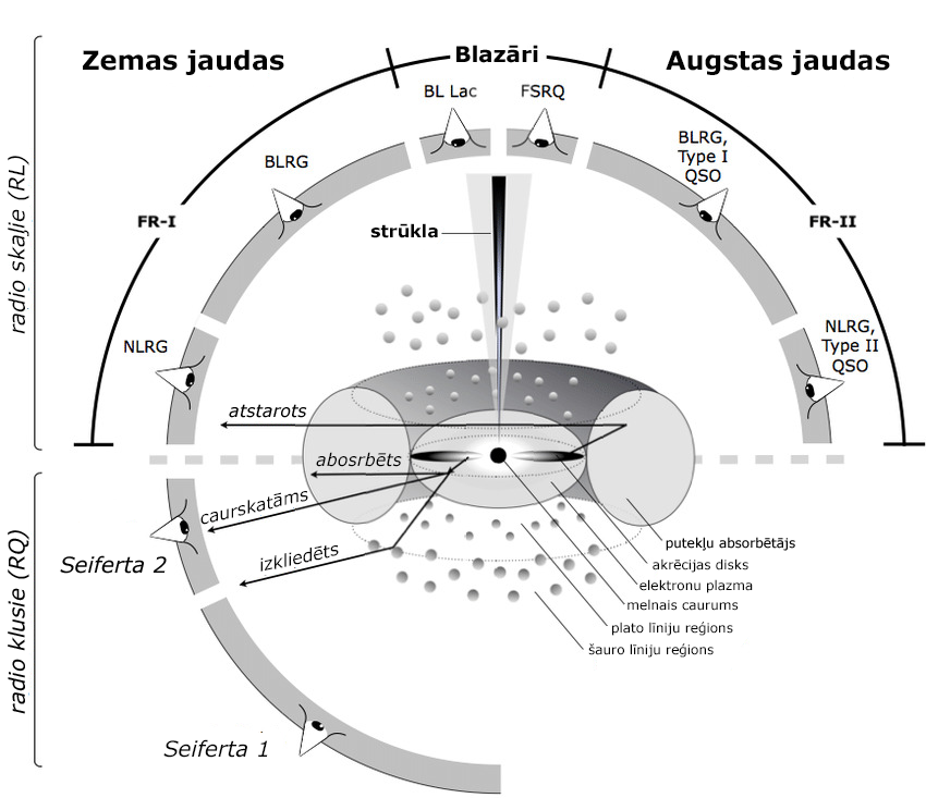 Ar pamatstruktūru tikuši galā, varam iet atpakaļ pie 11. attēla. Ko nozīmē visas actiņas šajā attēlā? Tā ir tā būtiskākā ideja apvienotajai teorijai - aktīvās galaktikas veids ir atkarīgs, no kāda leņķa tiek novērots. Piemēram, ja mēs skatītos aktīvajai galaktikai tieši pretī strūklai, tad mēs to kategorizētu kā blazāru. Tomēr ja to pašu galaktiku mēs vērotu apakšas, kur strūklas nav, tad mēs tiektu, ka tā ir Seiferta galaktika. Šīs galaktikas sīkāk apskatīsim vēlāk, bet vispirms - kas ir radio klusas un skaļas galaktikas? Kāda loma ir to jaudai?