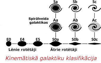 Ir vēl dažnedažādas klasifikācijas, kas, piemēram, iekļauj to fizikālās īpašības, kā starjaudu. Vai arī sadala tās trijās kategorijās - cik tās ir sablīvētas, asimetriskas un gludas -, un pēc tā atķšir dažādas galaktikas. Tomēr viena no veiksmīgākajām klasifikācijām ir pēc to zvaigžņu kinemātiskās un dinamiskās kustības (9. att.).  Īsumā, ar šo metodi apskata, cik organizēti vai haotiski zvaigznes kustās galaktikā, un pēc tā tās var iedalīt vairākās kategorijās. Tomēr šīs kategorijas var reducēt uz divām kategorijām vien - ātrie un lēnie rotētāji. Tātad eliptiskās galaktikas rotē lielākoties lēni, un jo plakanākas tās ir, jo ātrāk tās rotē. Un ātrie rotētāji ir vai nu spirālveida vai lēcveida galaktikas. Šī klasifkācija lieliski parāda galaktikas evolūcijas gaitu no labās uz kreiso pusi, kā arī tā ir praktiski neatkarīga no galaktikas leņķa pret novērotāju, jo zvaigzņu ātrums nemainīsies!