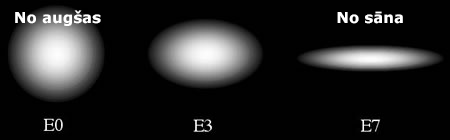 7. att. Ilustrācija, kā elliptisko galaktiku klasifikācija ir atkarīga no novērotāja leņķa pret vienu un to pašu galaktiku (Cosmos attēls)