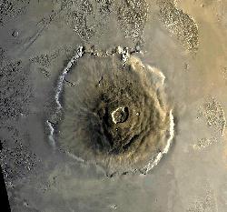 | Marsa virsma. Attēla apakšdaļā redzams Marinera kanjons, pa kreisi – lielie nodzisušie vulkāni. NASA/JPL attēls. 17 kb | Milzīgais Marsa kalns – Olimps. NASA/JPL attēls. 46 kb |