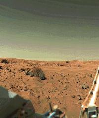 | Marsa panorāma, ko uzņēmusi zonde Viking. NASA/JPL attēls. 28 kb | Marsa akmeņainā virsma. Attēlu ieguvusi zonde Mars Pathfinder. NASA/JPL attēls. 28 kb |
