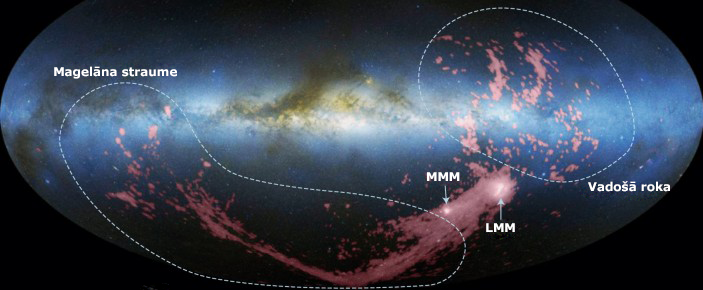 18. att. Magelāna straume, kas redzama kā sarkanais triepiens un Piena ceļš, kas redzams fonā. (MMM - Mazais Magelāna Mākonis, LMM - Lielais Magelāna Mākonis) (ESA/NASA attēls)