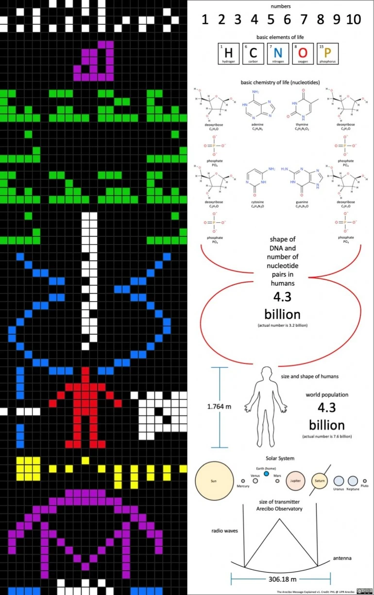 23. att. Vēstījuma atšifrējums saprāta brāļiem, kas tika nosūtīts kosmosā 1974. gadā (NASA attēls)