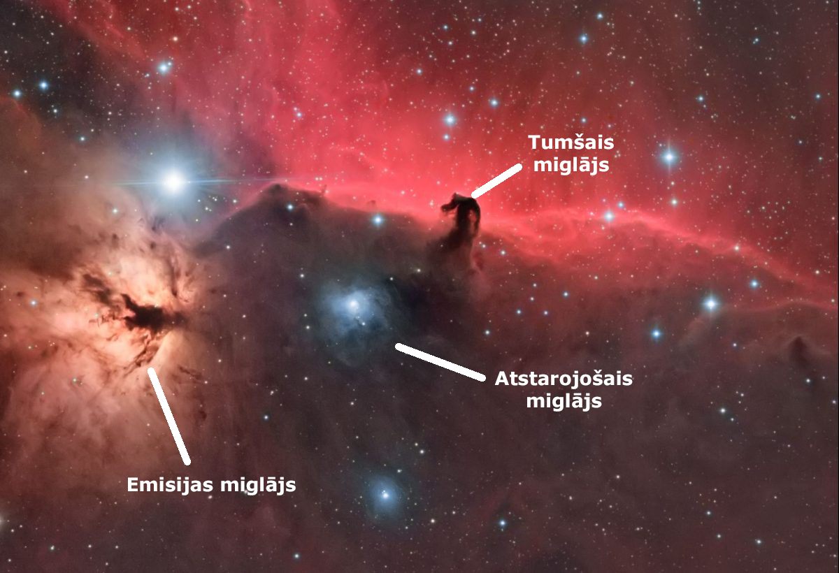 Tikai nelielai daļai miglāju tuvumā vai to iekšienē atrodas kāda spoža zvaigzne. Lielākā daļa miglāju ir tumšie jeb absorbcijas miglāji, kas saskatāmi tikai tad, ja atrodas uz gaiša miglāja fona vai zvaigžņu fona. Tāds, piemēram, ir Zirga Galvas miglājs Oriona zvaigznājā (7. att.). Tā kā tumšajos miglājos nav nekādu “sildelementu”, tie ir ļoti auksti.