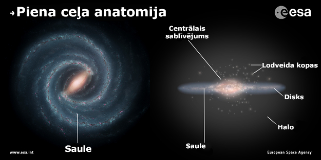 2. att. Galaktikas anatomija jeb struktūra (pa kreisi: NASA/JPL-Caltech; pa labi: ESA ESA/ATG medialab attēls)