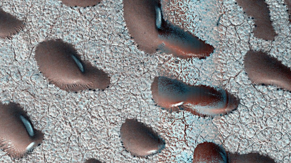 NASA satelīts ir uzņēmis fascinējošu attēlu, kurā redzami veidojumi, kas izskatās kā izbirušas brūnās pupas uz Marsa ziemeļu puslodes smilšu kāpām. Šīs "pupas" nav nekas ēdams – tās ir sasalušas smilšu kāpas, kas veidojušās Marsa virsmā. Šādi veidojumi ir nozīmīgi, jo tie var sniegt vērtīgas norādes par ūdens klātbūtni uz planētas un tās vēsturi. Kā norāda "Live Science", šie smilšu veidojumi var palīdzēt izprast, vai Marsā kādreiz ir pastāvējusi pietiekami daudz šķidra ūdens, kas būtu spējis atbalstīt dzīvību.