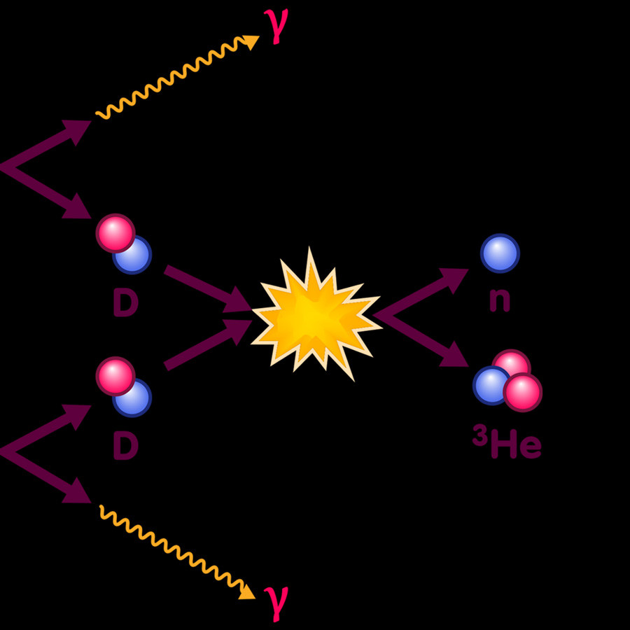 5. att. Hēlija izveidošanās procesa ilustrācija. Nepieciešami divi Deitērija atomi, kas savienojoties, rada Hēlija izotopu. Tad šim Hēlija izatopam savienojoties ar tādu pašu, tiek izveidots Hēlijs (Einstein online attēls)