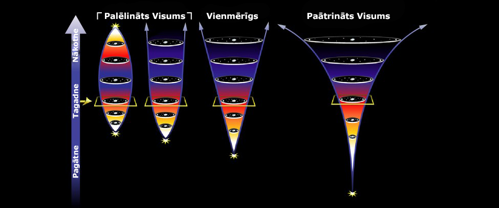 9. att. Visuma izplešanāš modeļi. Palēlināts var būt gan tāds, kas nākotnē sarausies līdz singularitātei, gan beigs izplesties pēc bezgalīga laika. Vienmērīga izplešanās ir, kad tas izplešās ar vienmērīgu ātrumu. Savukārt paātrināta izplešanās ir, ka tas nemitīgi paātrina savu izplešanās ātrumu laikā. (Pārveidoti attēli no NASA/ESA)