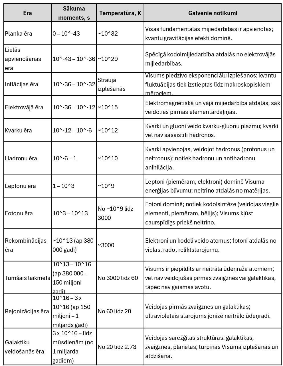Tabula 1: Visi būtiskākie Visuma periodi ar norādītu laiku un aptuveno temperatūru