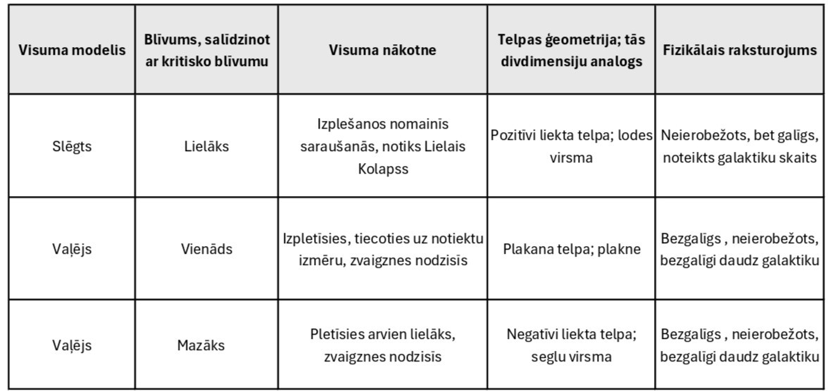 Tabula 1: Visuma iespējamā ģeometrija un nākotnes scenārijs