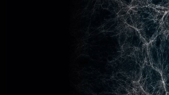 7. att. Tumšā laikmeta attēlojums pa labi, kas lēnām pārtop "gaišākā" laikmetā, kad sāk veidoties dažādas struktūras Visumā. Attēlā redzama Visuma tīkla attīstība laikā (PBS attēls)