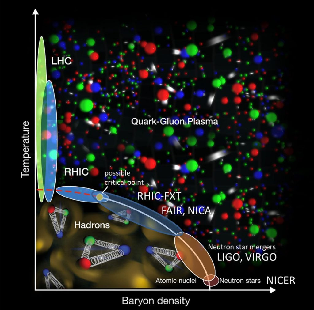 4. att. Fāžu diagramma, kas relatīvi attēlo, kādi apstākļi ir nepieciešami, lai eksistētu kvarku-gluonu plazma, kas bija dominējošā kvaru ērā (CEA-Irfu attēls)