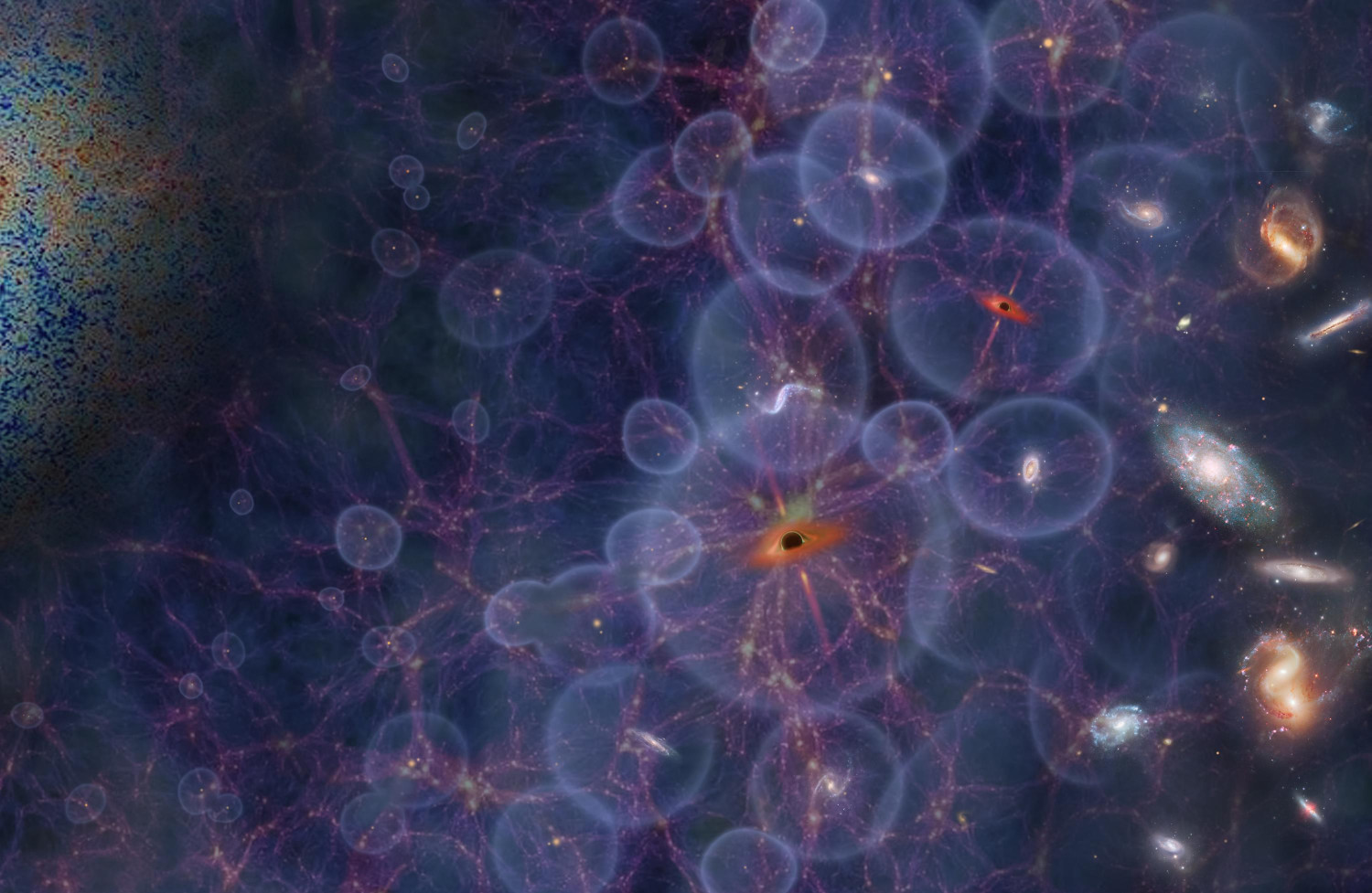 8. att. Rejonizācijas ēras attēlojums, kāveidojas pirmās zvaigznes un galaktikas, kas apkārt sev rejonizē esošos atomus (attēloti kā caurspīdīgie burbuļi) (Jingchuan Yu, Beijing Planetarium attēls)