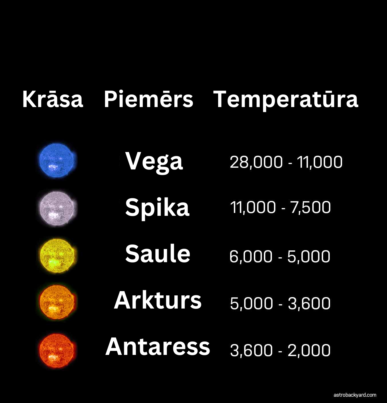 1. att. Zvaigžņu temperatūras un krāsas attiecība. Doti arī zināmu zvaigžņu piemēri (Astrobackyard.com attēls)