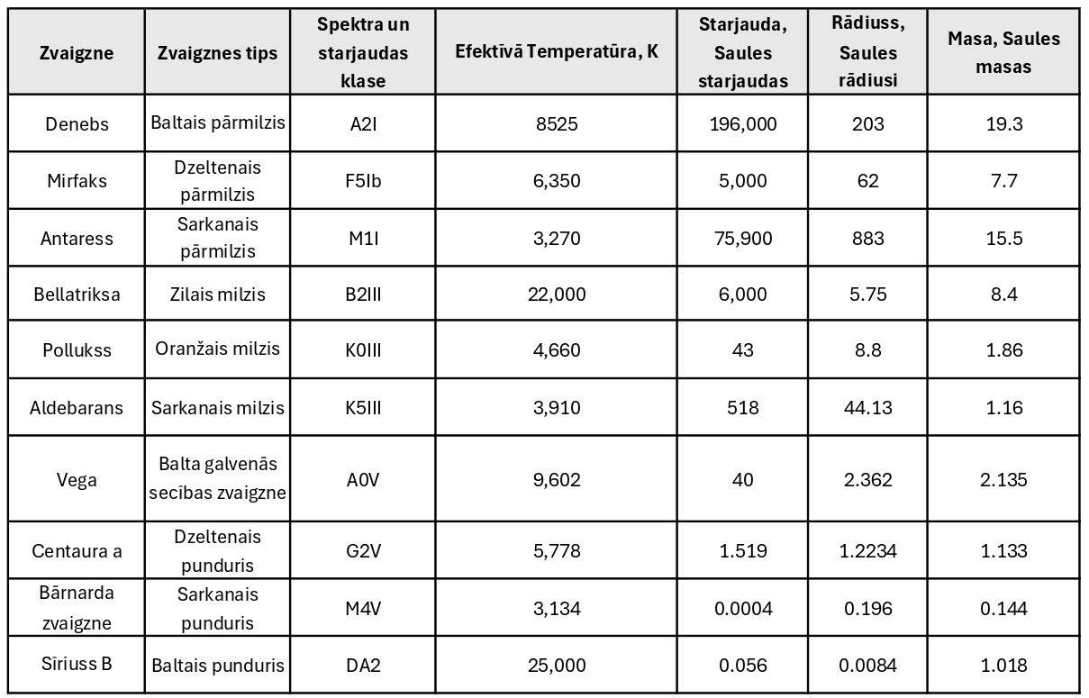Tabula 2: Dažu zvaigžņu raksturlielumi