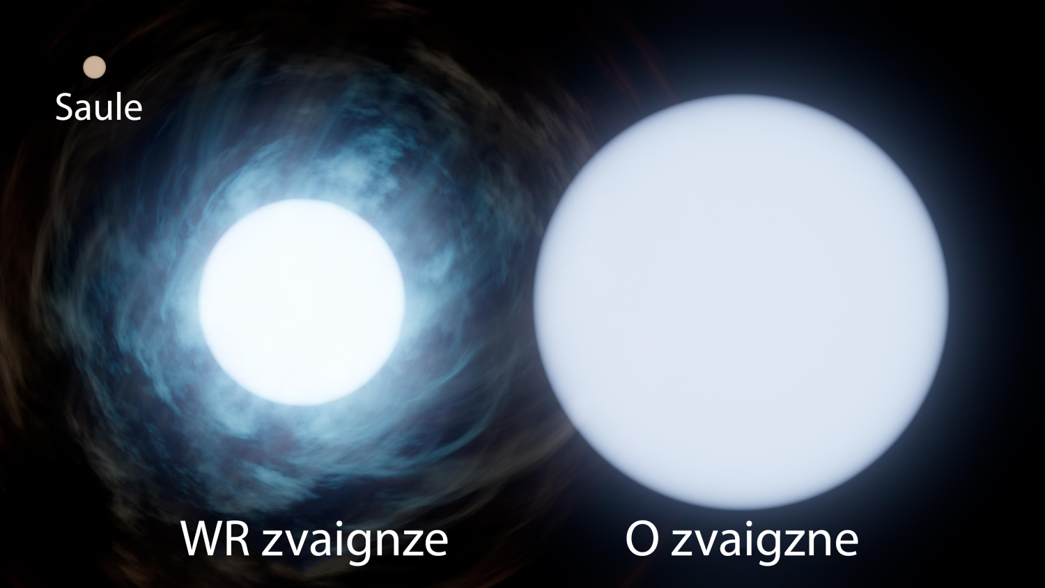 2. att. Ilustrācija ar salīdzinājumu Saulei, WR un O tipa zvaigznei (NASA/JPL attēls)