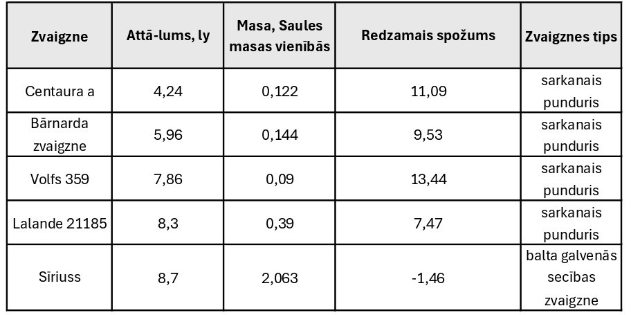 Tabula 5: Piecas Saulei tuvākās zvaigznes